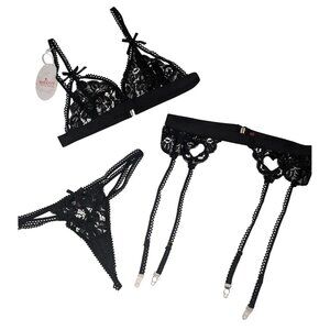 This elegant black 3-piece lingerie set features intricate lace and heart-shaped accents. Designed for comfort and allure, it includes adjustable straps for a customizable fit.