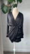 Elegant black mini dress. Features a draped design. Long sleeves with a deep V-neckline. Perfect for a night out.