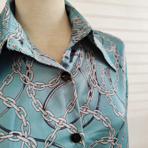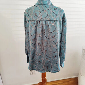 Pretty color blue with tassels and chain links on the graphics. Smart pointed collar. Button down. Tagged Size Large. No stretch. No signs of wear.