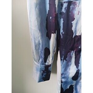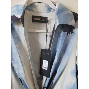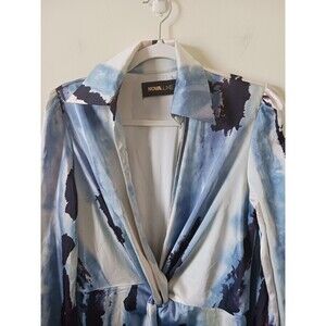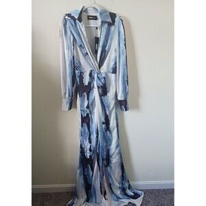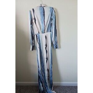 Elegant maxi dress with a deep V-neck. Features a stunning blue and white pattern. Long sleeves and a flowing silhouette.