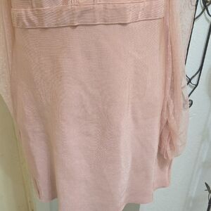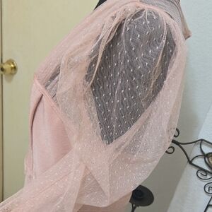 Chic blush pink dress with sheer sleeves. Perfect for weddings. Elegant, stretchy, and stylish.