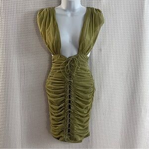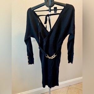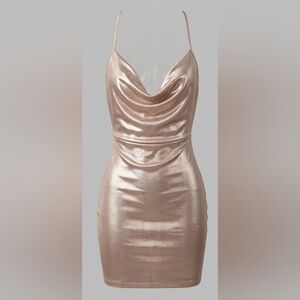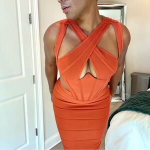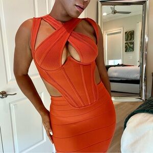Striking orange dress with backless design. Features unique cut-out details. Perfect for making a statement.