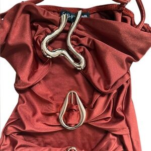 Turn heads in this sexy, figure-hugging rust mini dress! Features bold cut-out details, flattering ruching, and gold ring accents that elevate the look.