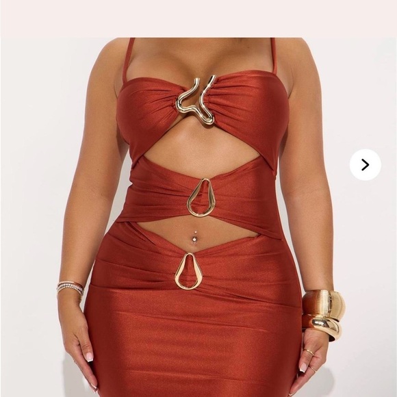 Turn heads in this sexy, figure-hugging rust mini dress! Features bold cut-out details, flattering ruching, and gold ring accents that elevate the look.