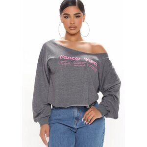 Fashion Nova ✦ Cancer Vibes Off‑Shoulder Top ✦ Charcoal Pink Zodiac Graphic S