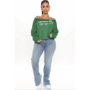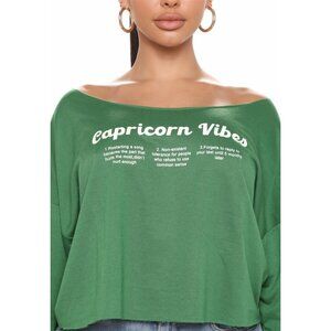 Fashion Nova ✦ Capricorn Vibes Off‑Shoulder Top ✦ Hunter Green Zodiac Graphic XS