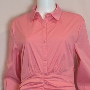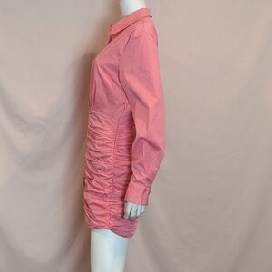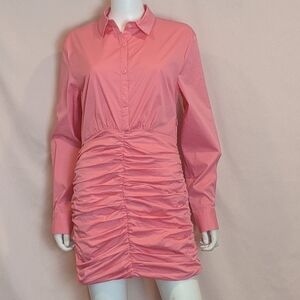 This long sleeve mini dress is made of a pink material, complete with a button up front and ruched skirt, perfect to draw attention to your figure.