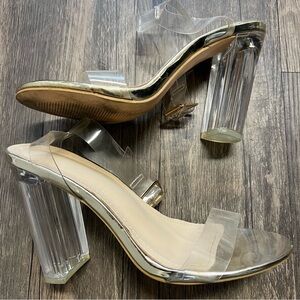 Fashion Nova Clear Strappy Block Heel Sandals Gold Buckle Transparent Straps 8
