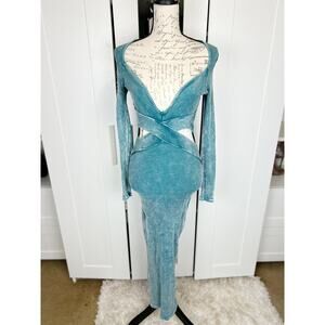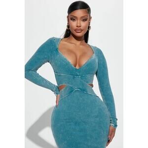 Fashion Nova Blue Teal Cloud Eleven Stretch Ribbed Maxi Dress Size Medium. New Without Tags (NWOT). Long sleeves. Deep V Neck. Front Cut Out Accents. Stretch. Ribbed fabric. Bodycon silhouette. Imported.