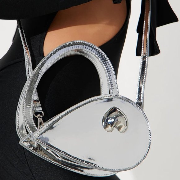 Heart-shaped clutch with top handle, top zip closure, and detachable crossbody strap.