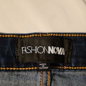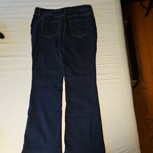 Chic dark blue flare jeans. Used but clean. only damage is slight wear on back of legs at hem. Not as stretchy as other Fashion Nova jeans, I think they fit more like a 16. 32 inch inseam. Allergy warning: household has both cats and dogs.