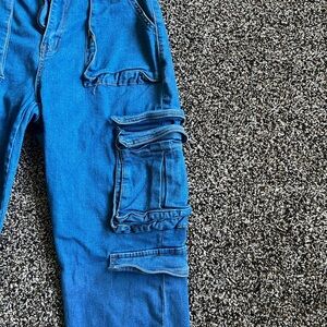 Classic denim jeans with a stylish cargo look and elastic ankles. Perfect for casual wear, size medium.97% algodon, 3% elastic