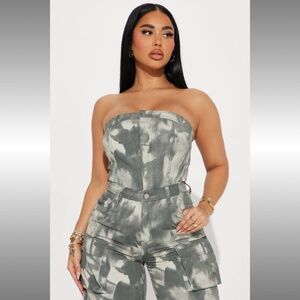 *NWT* gray / combo Fashion Nova Headstrong denim jumpsuit in a size XL. Features sleeveless, tube, button down, cargo & wide leg. Non-stretch.