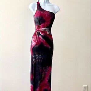 Features/Accents: Gown, Tie Dye, Red & Black Tie Dye, Stretch, Side Split, Sleeveless, Asymmetrical, Belt Like Waistband, Abstract Design, Fitted, Form Fitting, One Shoulder