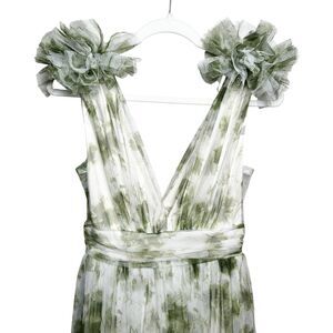 Features soft sage green floral tulle, a plunging neckline, and 3D puff shoulders that make a dreamy statement.
