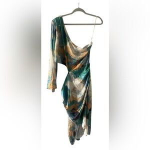 Step out in style with this elegant one-shoulder dress. Featuring a vibrant mix of blue, green, and gold, this dress is perfect for any occasion. The unique design and bold colors make it a standout piece in your wardrobe.