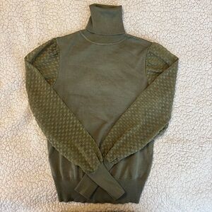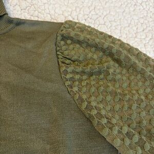 Sage green Fashion Nova turtleneck with mesh sleeves. The sleeves have a polka dot design throughout. Traditional turtleneck great for work or you can dress it up.