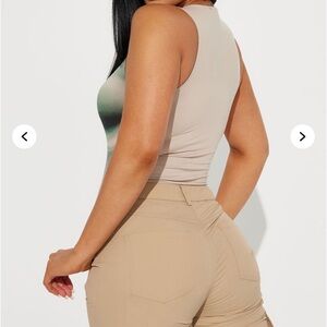 Sleek bodysuit with artistic design. Features a blend of green and beige tones. Perfect for a bold look.
