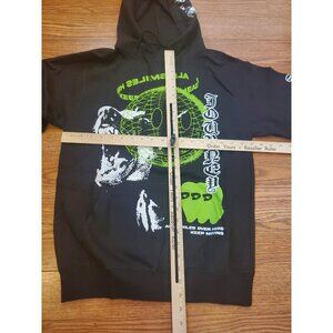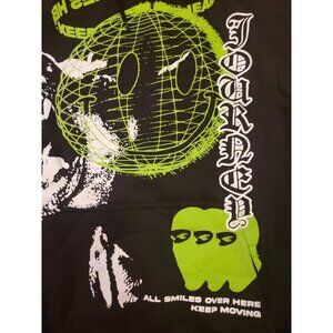 This Fashion Nova hoodie is new without tags. It can easily be unisex, just check the photos for measurements. The graphic print on the front has a Earth smiley face with a barking dog. The kangaroo pocket to the front says, "All smiles over here, keep moving." There is a graphic print to the left sleeve. The right sleeve is blank along with the back of the hoodie. The hood has a graphic print on the left side that is of a barking dog and again it says, "All smiles over here, keep moving."