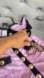 Stylish pink and black set with chain details. Features a chic top and matching skirt.