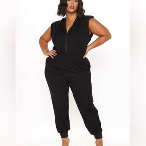 Fashion Nova Isabel Shoulder Pad Sweat Black Hooded Jogger Jumpsuit NWT Size 1X