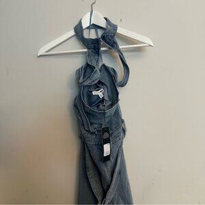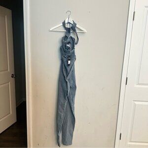 Sleek and stylish light blue jumpsuit. Features a halter neckline and belted waist. Perfect for a trendy look. NWT. Available In Light Wash.