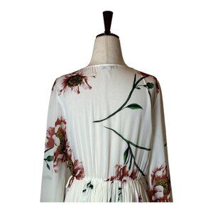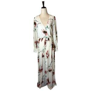 This dress from Fashion Nov is in excellent condition. It is in an allover floral print a in ivory and pink colors. It features; maxi length, long sleeves with wide button cuffs, surplice v-neckline, side slit, elastic waist, partially lined and in a form-flattering fit and flare silhouette. Made from 100% Polyester.