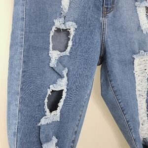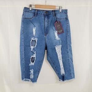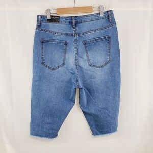 Fashion Nova Lost at Sea bermuda denim shorts in Light Blue. High waisted. Faux front pockets. Destroyed look. Distressed with lots of holes. Ultra steetchy denim. Frayed raw edge hems.