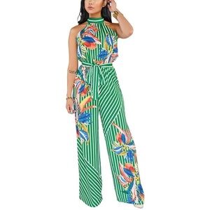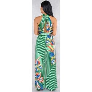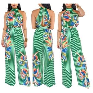 Fashion Nova M Green Jumpsuit Halter Style Tropical Sleeveless Sexy Vacation