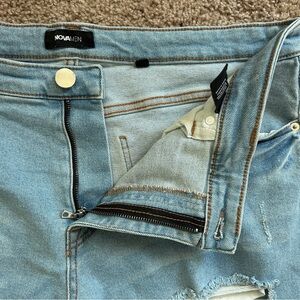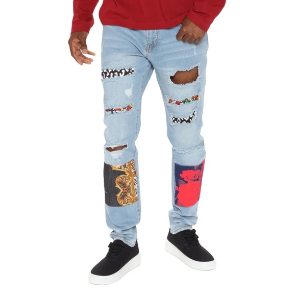 Fashion Nova Men jeans, Fashion Nova patchwork skinny jeans, men’s size 38 jeans, medium wash blue jeans, ripped skinny jeans, distressed patchwork denim, streetwear jeans for men