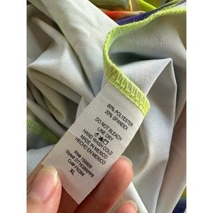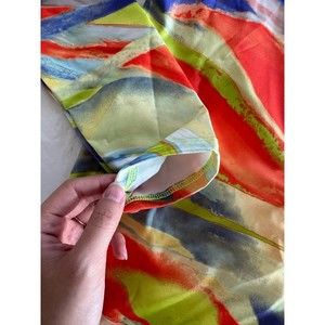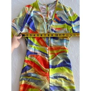 Fashion Nova Multicolor Art Masterpiece Romper. Front has a deep v neck. On the back there are 2 strings you can use to adjust how exposed you want your back. Butt area has the “butt scrunching” material.