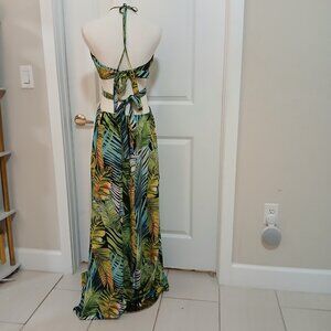 multicolor palm leaf print in vibrant shades of green, blue, and yellow. Designed with a halter neckline, it ties at the back for an adjustable fit and has stylish cutout sides with a ring detail at the front for added flair. The floor-length maxi silhouette flows beautifully, creating an elegant yet relaxed look. Made from 100% polyester, it is lightweight and comfortable to wear. This dress is brand new with tags and is available in size XL.