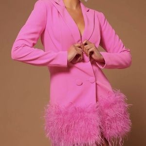 Chic pink mini dress with feathered hem. Double-breasted design. Perfect for a bold statement.