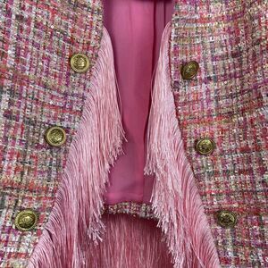 Fashion Nova Pink Tweed Fringe Blazer Jacket Long Sleeve Carrie Bradshaw Style