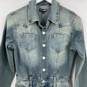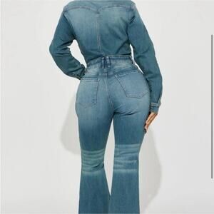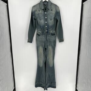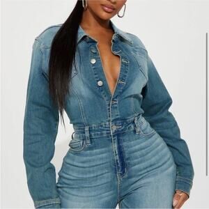 Fashion Nova Playing Games Denim Jumpsuit Flare Leg Blue Stretch Long Sleeves Button Zip Closure Collared Pockets Medium Wash