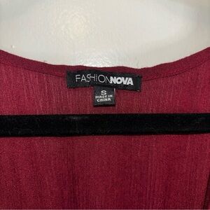 This stunning red maxi by Fashion Nova features a flattering v-neckline and cap dolman sleeves, perfect for a cocktail night. The dress showcases pleated and ruched details, adding texture and sophistication to its design. Its backless style enhances its allure, making it a standout choice for any special occasion. Dress is sheer material in a beautiful wine red color.