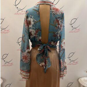 Fashion Nova. Size Small. Aqua Floral. Open Back. Crop Bodice Lined, Sleeves unlined. Top. Shoulder to hem 17". Sleeve 23". Border print.