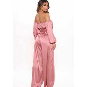 Fashion Nova Stay Fabulous Mauve Satin Off‑Shoulder Belted Wide‑Leg Jumpsuit S