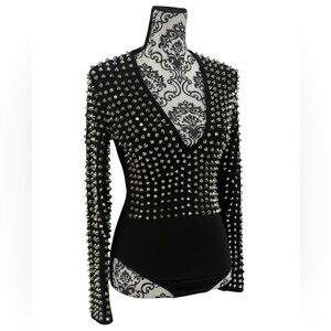 Fashion Nova Studded Black Long Sleeve Bodysuit Deep V-Neck Party Top S