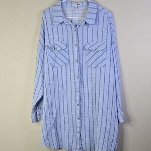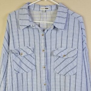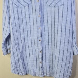 Stylish blue striped button-up shirt. Features a classic collar and buttoned pockets.