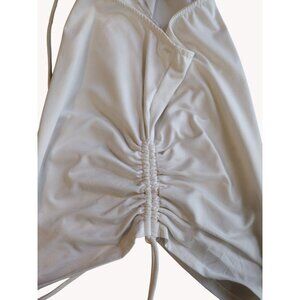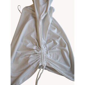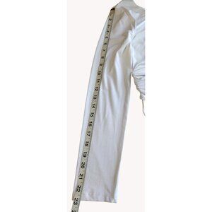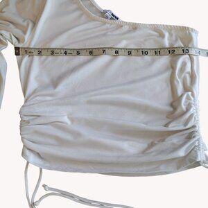 The Fashion Nova cold shoulder top in medium size features a solid white color with a one-shoulder neckline and long sleeves. Made from a blend of polyester and spandex, this blouse is easy to care for and lightweight, perfect for casual or party occasions. Its cropped style and regular fit make it a versatile option for the summer, fall, or spring seasons. Hand wash only to maintain its quality and add a touch of California love to your wardrobe.