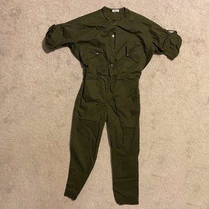 Like new, only worn once for a photoshoot as seen above. No signs of wear, no tears. Skinny Leg Jumpsuit, Short Sleeve, Button Down Front, Front Pockets, Drawstring Waist, Non Stretch