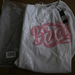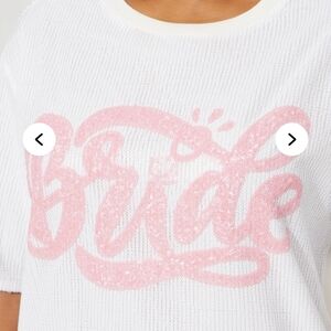 Stylish white t-shirt dress featuring a pink graphic. Accented with fringe hem for a trendy look. Perfect for the bride to be or bridal shower! New in original packaging.