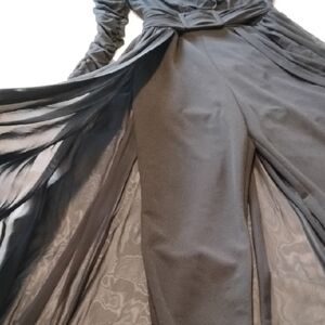 Women's mesh jumpsuit, one sleeve, belted, attached wrap skirt, Black, Size: M