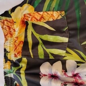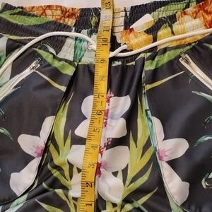 Vibrant tropical floral print pants with a drawstring waist. Features green, yellow, and orange hues.