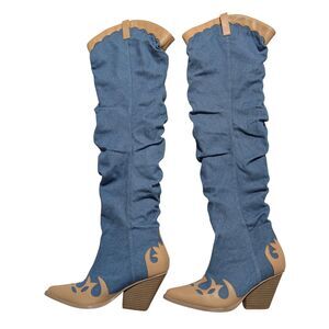Keywords: Ruched boots, Denim boots, Gift ideas, Cowgirl, Sexy, Christmas, cowboy boots, western boots, over the knee boots, OTK boots, jean boots, denim boots, pointed toe boots, knee high boots, faux leather boots, fashion boots, womens boots, blue boots, beige boots, size 5.5 boots, designer inspired