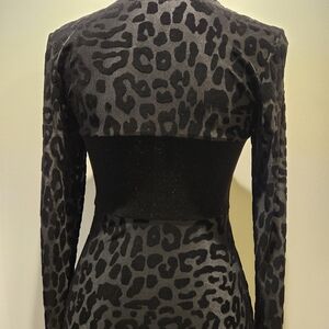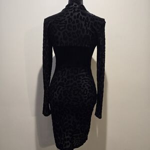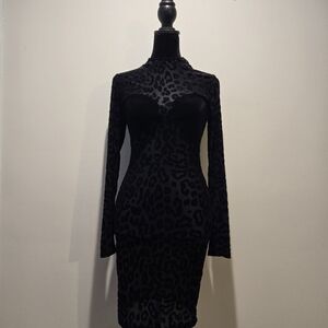 50% polyester, 40% nylon, 10% spandex. Lining 100% polyester. Black and tight body forming see-through animal print mini dress. Animal spots, chest, and back coverage is velvet like material. Mock neck. If you're looking for sexy, THIS is it. Minimal signs of wear. Ships fast and clean!! Size small. Does have some stretch.