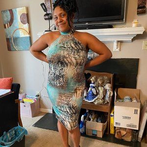 This XL Animal Print Fashion Nova dress has beautiful turquoise and black highlights.