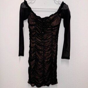Fashion Nova black mesh mini dress with long sleeves, rushed bodice, and lace up