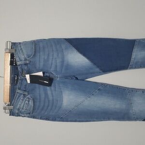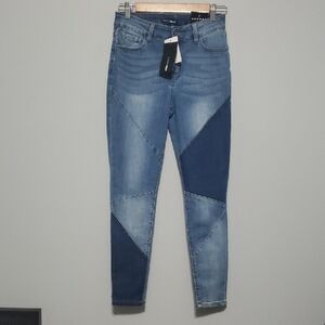 Fashion Nova jeans womens size 7 junuors stay in line mid rise mid-rise midrise skinny jean medium wash two-tone artsy artzy patchwork diagonal pattern art hues of blue pretty jeans!